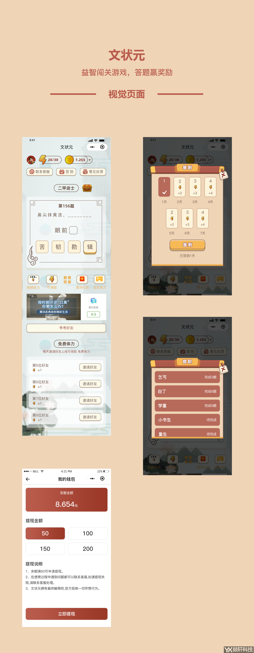 文狀元是由專業的鄭州小程序開發公司燚軒科技為投資者個性化定制開發的,一邊玩游戲一邊掙錢,益智答題闖關游戲,激活大腦細胞潛能,提高智商神器。看看誰才是才高八斗、學富五車的知識人!